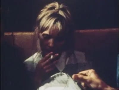 So—and sorry to spoil Wanda—why, in the end of the movie, does she not get sent to jail, as the ‘real’ person, the source inspiration, did? Instead, Loden has her continue to drift, to come upon yet someone new who invites her in. But she’s not really in. In the final scene, she is seated at a roadhouse table with a crowd of people, all drinking, laughing, talking—she’s been enveloped by their little community but she is not engaging, exactly. The camera watches her worried, stony face. She lights a cigarette. It seems she can never access society. Do all things pass through her? Is she trapped or transcendent?